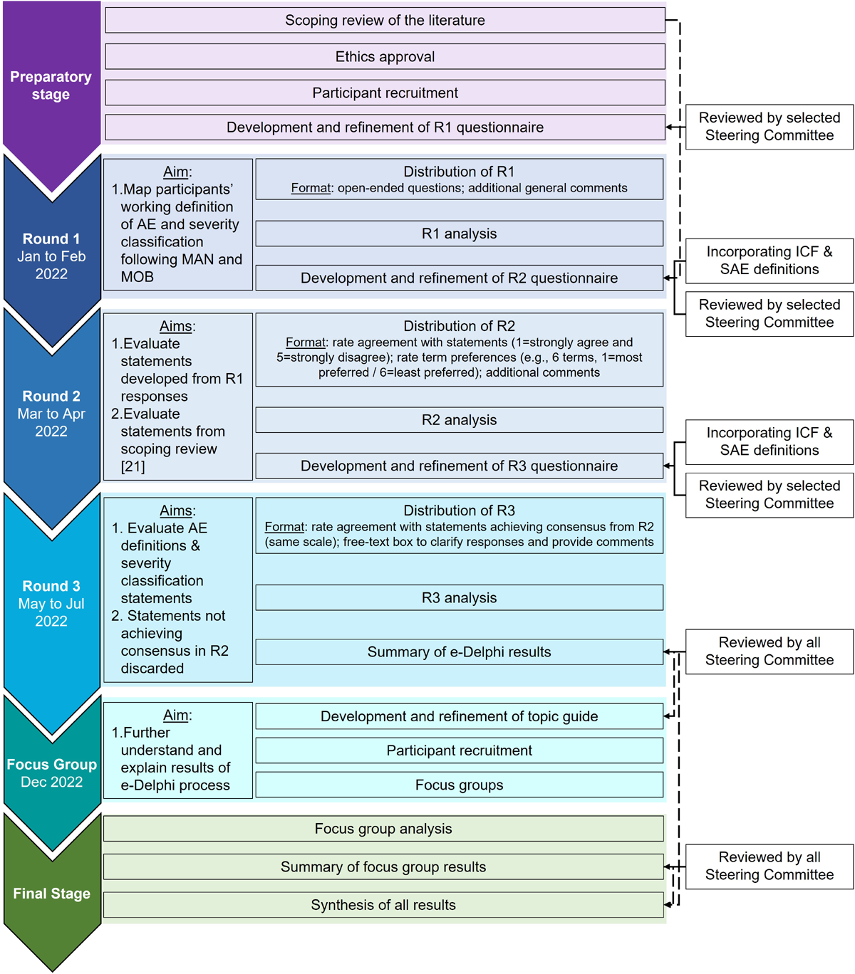 Due to the large heterogeneity of terms, definitions and classifications derived from round 1 responses, specific protocol deviations were deemed appropriate for the round 2 questionnaire: