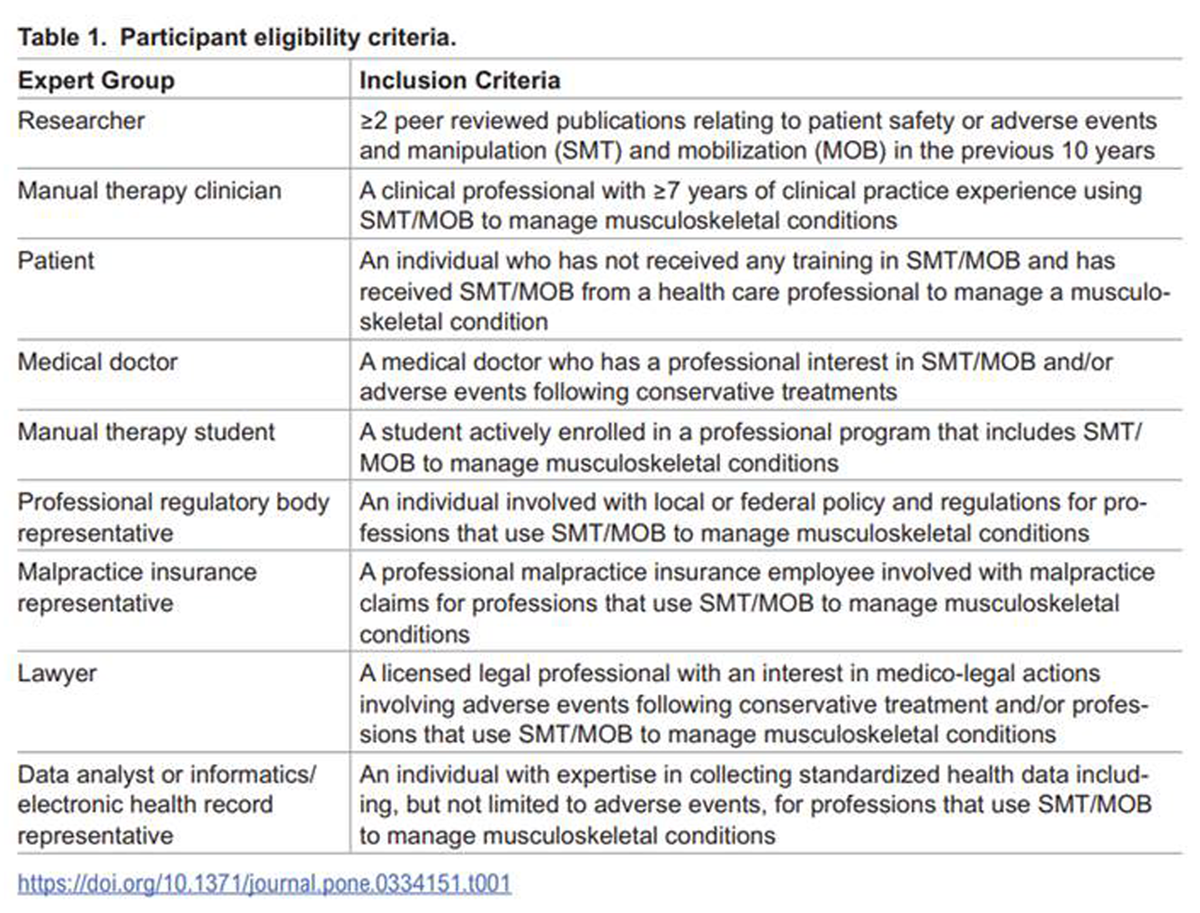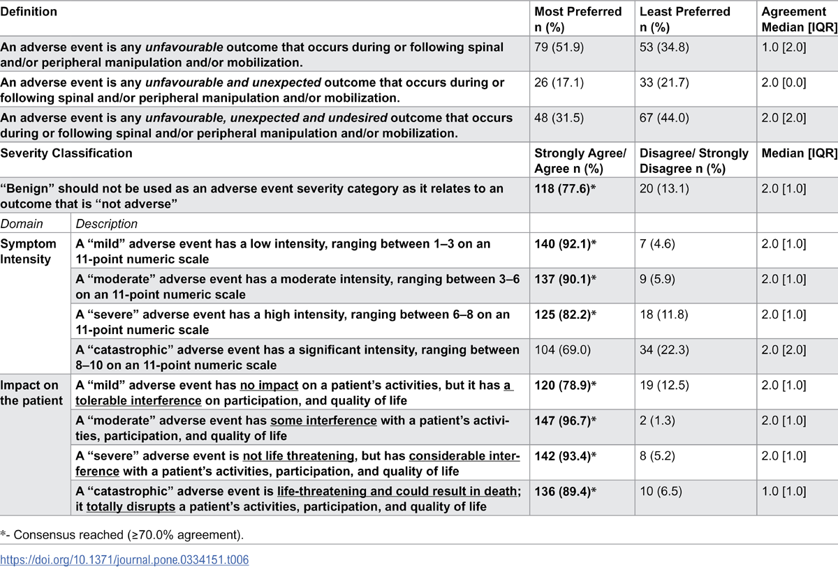 Additionally, the heterogeneity in AE definitions also precludes the accurate reporting of AEs and hinders effective communication among healthcare professionals, which can negatively impact patient outcomes. Therefore, to address this need, this study aimed to establish an inter-professional and international standardized definition and severity classification for AE following spinal and peripheral joint manipulation and mobilization, within an adult population with musculoskeletal conditions.