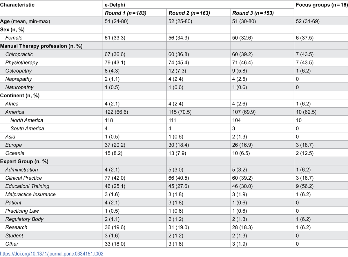 Demographic characteristics of participants in each e-Delphi round and the focus groups are presented in Table 2. While all e-Delphi rounds had respondent representatives from all expert groups and most continents of the world, focus groups had representatives from most expert groups and continents.