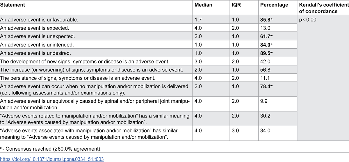 The e-Delphi process consisted of three rounds of questionnaires (Fig 1). A detailed description of each round was previously provided. [22] Briefly, round 1 questionnaire consisted of open-ended questions of participants’ current understanding of definition and severity classification of AEs following joint MAN and MOB. Round 2 included statements developed based on round 1 responses and findings from a previous scoping review of the literature mapping the definition and classification of AEs previous studies investigating joint MAN and MOB used. [19] Round 3 included feedback from round 2 using descriptive statistics to promote participant reflection and the questionnaire consisted of statements from round 2 that reached consensus for further agreement.