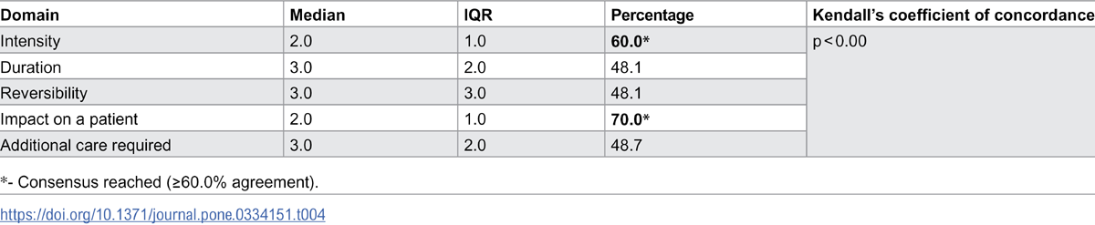 Consensus was reached for severity categories (i.e., mild, moderate, severe and catastrophic) and on 2 domains to differentiate these categories (i.e., symptom intensity and impact on patient).