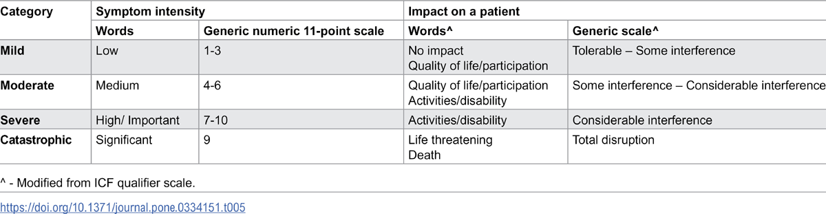 There was consensus that the magnitude of symptom intensity and impact on patient would allow for differentiation between severity categories (Table 6).