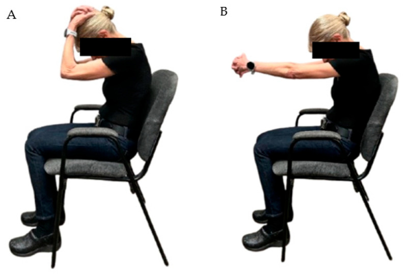 Int J Environ Res Public Health 2026 (Jan 19); 23 (1): 120 Figure A1. (A): Forward neck stretch, (B): Upper back stretch. Images of the first author are by Carson Robertson.