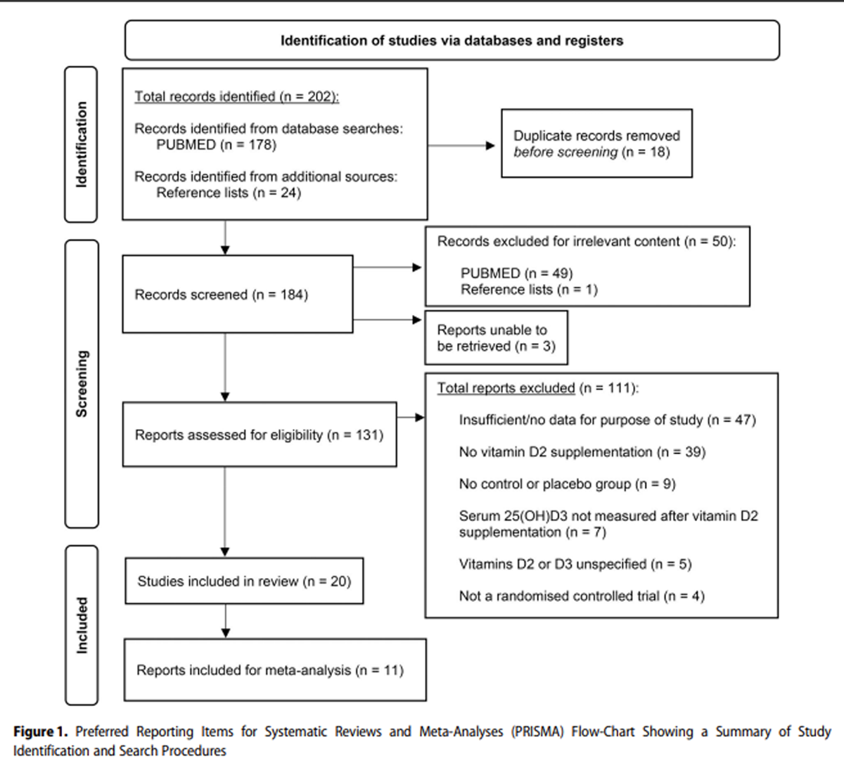 The aim of the present study was to review current RCT evidence to quantify the amount by which serum vitamin 25(OH)D3 concentrations decrease when study participants receive vitamin D2 supplementation compared to those who received a placebo or were unsupplemented controls.