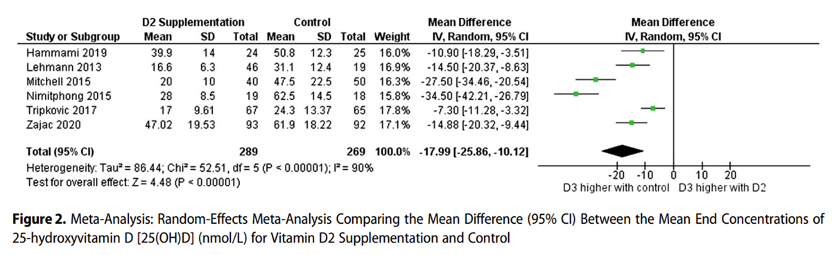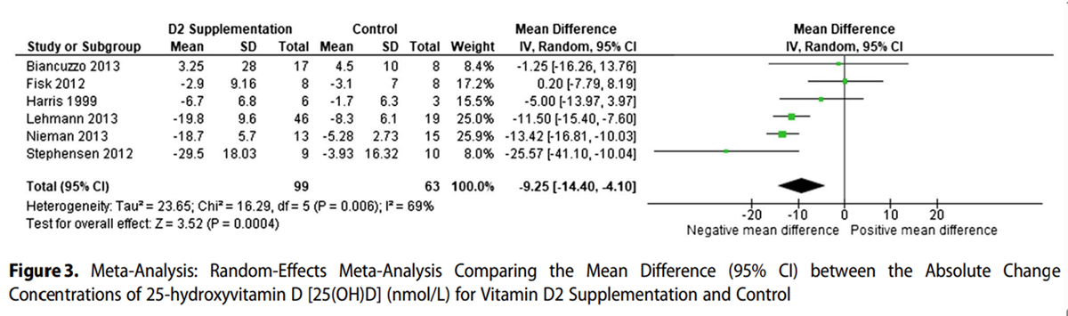 Data analysis: In meta-analyses there was a reduction in serum 25(OH)D3 after vitamin D2 supplementation compared with control for end-of-trial between-groups data (random weighted mean difference [WMD] = -17.99 nmol/L; 95% CI, -25.86 to -10.12; P < .00001) and absolute change over the trial (random WMD = -9.25 nmol/L; 95% CI, -14.40 to -4.10; P = .0004).