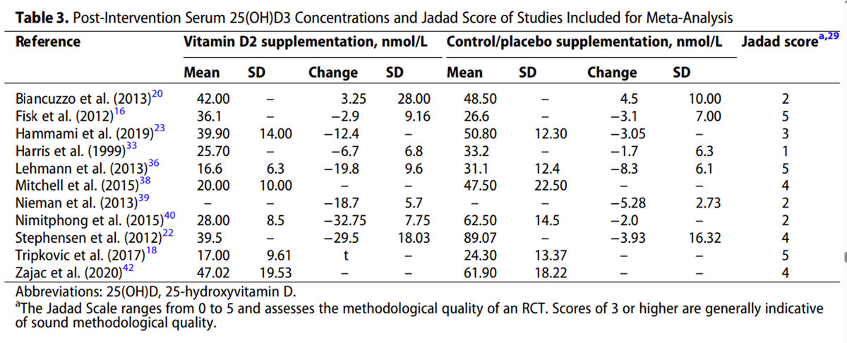 The aim of this study was to review the current RCT evidence to quantify the amount by which serum vitamin 25(OH)D3 concentrations decrease in study participants who receive vitamin D2 supplementation, compared participants who received a placebo or were unsupplemented controls. Of the 20 articles in the systematic review, 18 found that vitamin D2 supplementation was associated with a decrease in serum 25(OH)D3 concentrations. Although a rise in serum 25(OH)D3 after vitamin D2 supplementation was reported in 1 article, [20] the increase was less than that of the placebo group. The rise in 25(OH)D3 could be the result of confounding UV exposure from sunlight, as the study ran from February into May when UVB wavelengths in Boston can produce dermal vitamin D. [43]