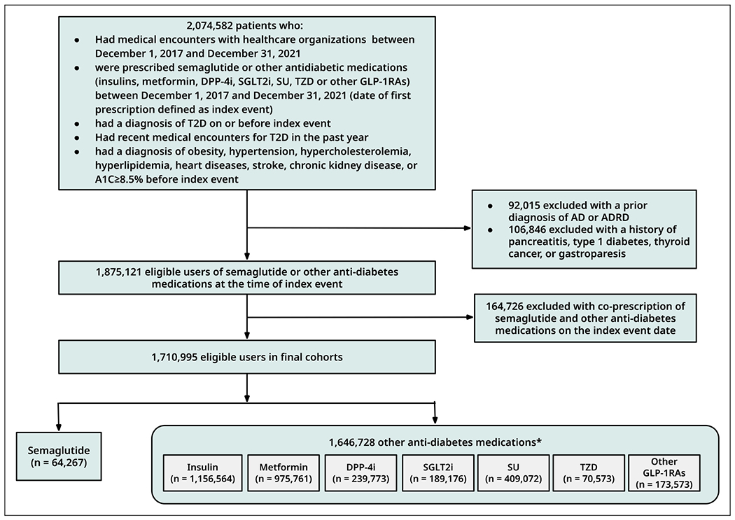 Study flow diagram. DPP-4i: dipeptidyl-peptidase-4 inhibitor; GLP-1RA: glucagon-like peptide-1 receptor agonist; SGLT2i: sodium-glucose cotransporter-2 inhibitor; SU: sulfonylurea; T2D: type 2 diabetes mellitus; TZD: thiazolidinedione. *The combined total of patients (n = 1,646,728) in the comparison arm is not a sum of the patients from each of the 7 comparison antidiabetic medication groups because a patient could be prescribed more than one antidiabetic medication during the study period, though there was no overlap between semaglutide and each of the comparison medication groups.