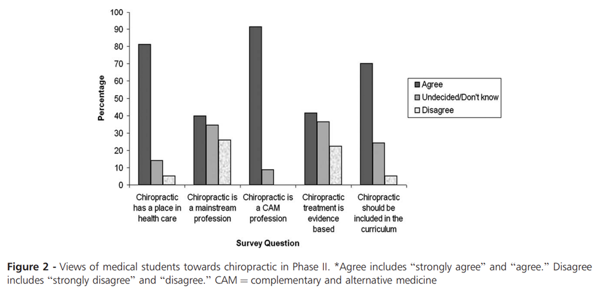 One strategy for overcoming the barrier of negative perceptions of chiropractic among current and future physicians is providing them with education on chiropractic. This may help to facilitate interdisciplinary training and interprofessional collaboration between chiropractors and other health care providers. However, few studies have taken the important steps of evaluating the effectiveness of educational sessions on improving attitudes, knowledge, and perspectives towards chiropractic. Hopper et al. [27] found that a 1–hour lecture on CAM was effective in changing attitudes of medical students towards complementary therapies. The inclusion of education on complementary therapies within formal medical curricula appears to improve attitudes towards CAM, particularly in the early years of study. [28, 29] Conversely, medical students with no previous experience or exposure to chiropractic tend to have more negative attitudes towards the chiropractic profession. [26] However, to the best of our knowledge, it is unknown whether education on chiropractic for medical students would be effective in improving their attitudes and knowledge specifically towards chiropractic. This is important to help determine whether interprofessional education is effective in promoting future collaboration between chiropractic and other health care providers, including medical physicians.