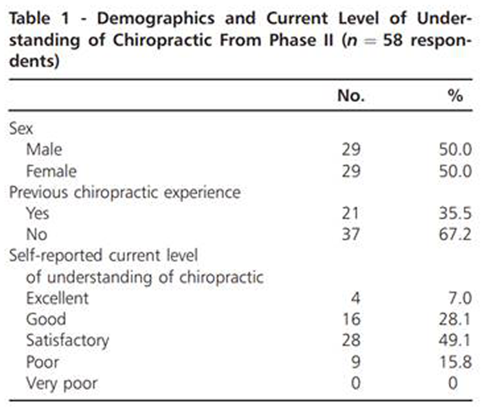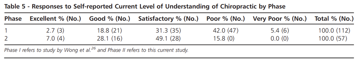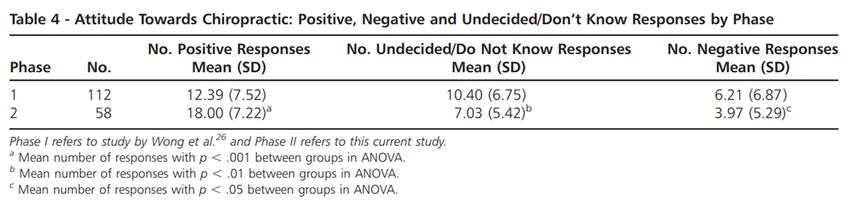 There also are limitations to this study. First, the surveys were not individually coded, and, therefore, individual change from Phases I and II within subjects could not be determined. The change from Phases I and II are between groups and the respondents comprising the groups may have differed between phases. However, the respondents who are most vocal about chiropractic are more likely to have responded, and this would have applied to both phases.