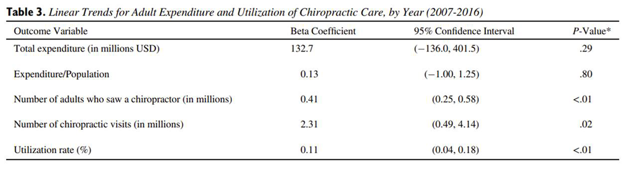 Conclusion: The findings showed statistically significant increasing trends for the number of adult chiropractic users, the number of visits, and percent utilization of chiropractic care from 2007 to 2016. Conversely, we found a statistically null trend for the total annual expenditure on chiropractic care during the same time period. Findings from this analysis imply that, while chiropractic care appears to be growing, it may still be under-utilized, and more efforts should be devoted to ensuring sustained growth and a larger role in the management of musculoskeletal health.