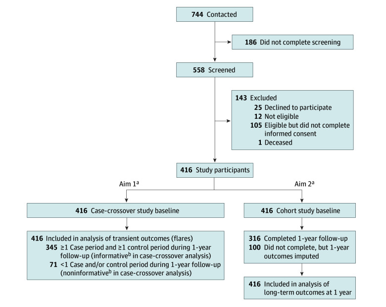 A total of 416 adults (mean [SD] age, 47.5 [10.9] years; 306 [75%] male and 104 [25%] female; 4 [1%] American Indian or Alaska Native, 21 [5%] Asian, 21 [5%] Black or African American, 5 [1%] Native Hawaiian or Other Pacific Islander, 279 [70%] White, and 35 [9%] multiracial) participated in the study) (Table; eTable 1 in Supplement 1). Participants completed 9,757 surveys during the 1–year follow-up, including a median (IQR) of 24 (9–30) of 36 possible scheduled surveys (completed within 3 hours of survey delivery) and 2 (1–5) flare window surveys. Of the 416 participants, 345 (83%) had at least 1 case and 1 control period and were informative for the first aim (Figure 1). Participants included in the case-crossover analyses were generally similar to those not included but were more likely to be female (92 [27%] vs 12 [18%]), less likely to report having LBP every day (167 [49%] vs 44 [62%]), and more likely to have lower levels of LBP intensity (mean [SD], 4.3 [2.2] vs 5.1 [2.4] numerical rating scale points) and functional limitations (mean [SD] RMDQ score, 11.8 [5.7] vs 14.1 [6.1]). Three hundred fourteen participants (76%) completed the 1–year RMDQ outcome, but all 416 participants had imputed 1–year outcome data and were included in analyses for the second aim.
