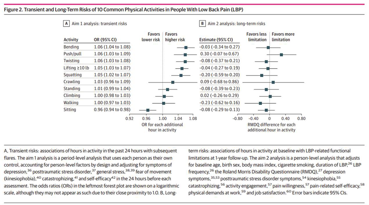 Conclusions and relevance: This study found short-term, transient risks of LBP flares associated with some activities but no associations with functional limitations at 1–year follow-up. These findings suggest that people with LBP who engage in more of these activities do not have better or worse long-term outcomes.