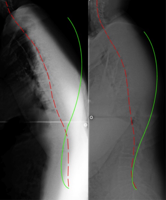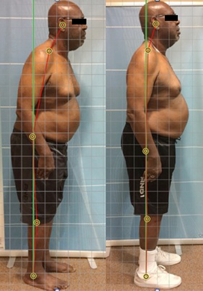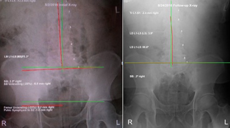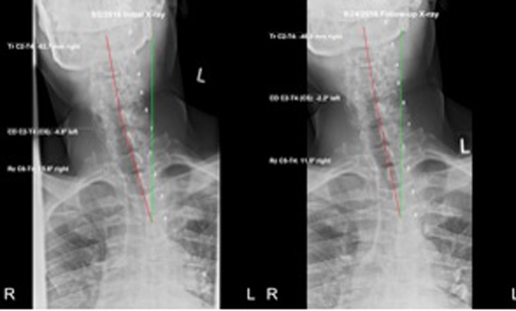 The patient’s posture as seen visually (Figure 1) improved dramatically. Follow-up radiographic assessment confirmed and quantified the significant improvements in the patient’s posture (Figures. 3–6).