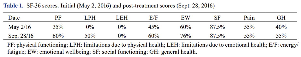 Of note, the patient had suffered previously from bacterial spinal meningitis (1975) and lumbar spine discitis resulting in fusion of L1/L2 (2015). He was currently taking carbidopa-Levodopa (dopamine) and mirapex (dopamine agonist) for his Parkinson’s symptoms. The SF-36 [4] scores were collected and are shown in Table 1.