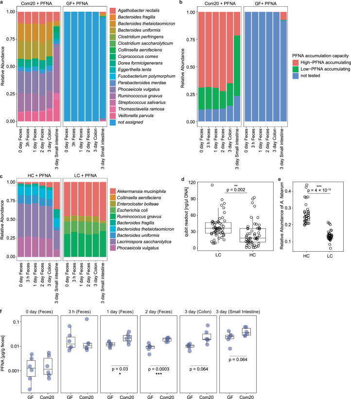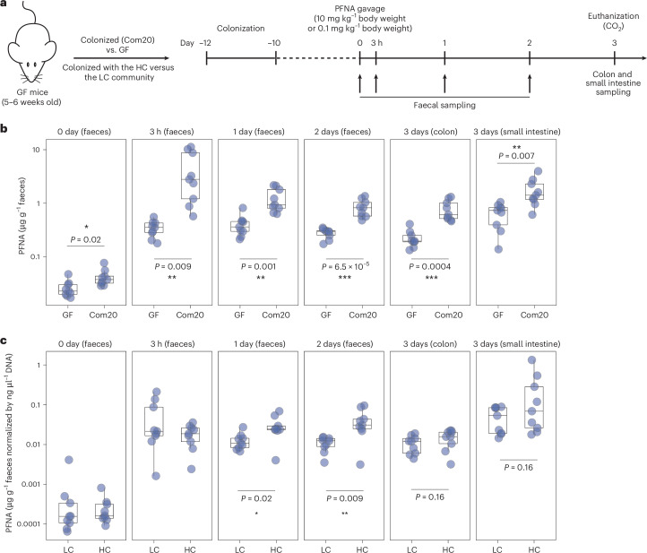 To determine whether bacterial PFAS bioaccumulation occurs in an in vivo context, we tested C57BL/6J mice colonized with a community of 20 human gut bacterial strains (Com20) [55] (Supplementary Table 6) against germ-free (GF) controls. The animals were administered a one-time oral dose of PFNA (10 mg kg-1 body weight) by gavage. This initial dose was selected based on previous reports indicating it causes no adverse effects in mice [56], while still allowing for reliable detection in their faeces. Faecal samples were collected over the following 2 days, and on day 3, colon and small intestine content samples were taken post-mortem (Fig. 5a). Faecal microbiota analysis using 16S rRNA sequencing showed that 17 of the 20 strains colonized the mice and PFNA treatment had no effect on the microbiota composition (Extended Data Fig. 10a,b). Colonized mice showed a significantly higher faecal PFNA concentration at all follow-up time points (3 h, P = 0.009, fold change (FC) = 7.9; 1 day, P = 0.001, FC = 2.6; 2 days, P < 0.0001, FC = 2.8; 3 days (colon), P = 0.0004, FC = 3.1; 3 days (small intestine), P = 0.007, FC = 1.9) (Fig. 5b). Next, we tested whether microbial communities containing high- versus low-accumulating species would cause differences in faecal PFNA excretion. GF mice were colonized with a community of either five high- or five low-PFNA-accumulating strains (LC: Akkermansia muciniphila, Collinsella aerofaciens, Enterocloster bolteae, E. coli and Ruminococcus gnavus; HC: Bacteroides fragilis, B. thetaiotaomicron, B. uniformis, Lacrimispora saccharolytica and Phocaeicola vulgatus; Supplementary Table 6). PFNA treatment had no effect on gut microbiota composition (Extended Data Fig. 10c); however, LC-colonized mice showed circa twofold higher colonization compared with HC-colonized mice (Extended Data Fig. 10d,e). HC-colonized mice showed increased faecal excretion of PFNA, normalized by bacterial biomass, on days 1 and 2 (1 day, P = 0.02, FC = 2.4; 2 days, P = 0.009, FC = 3.8) (Fig. 5c). We also carried out a GF versus colonized comparison using a 100× lower PFNA dose (0.1 mg kg-1 body weight PFNA), which showed the same trend of increased excretion for the colonized mice (Extended Data Fig. 10f). Together, the mouse experiments show the contribution of gut bacterial bioaccumulation to faecal PFAS excretion.