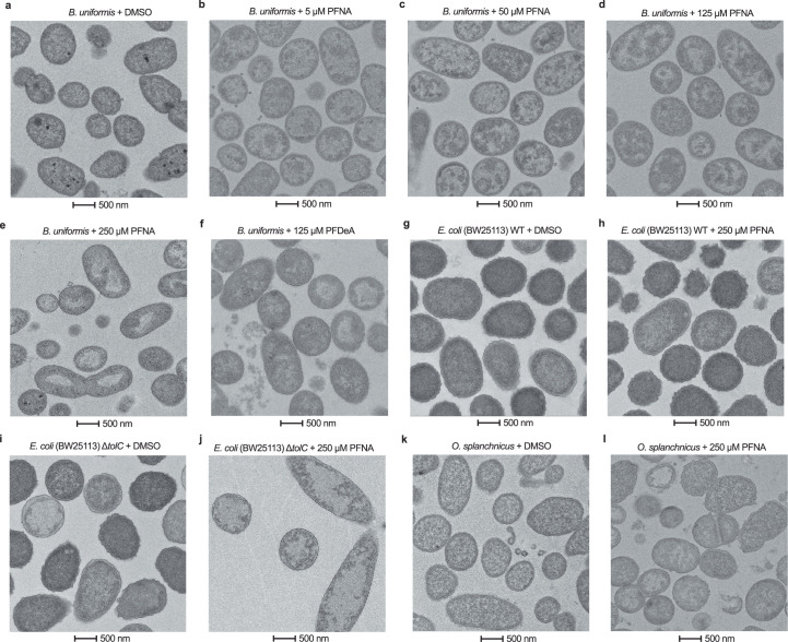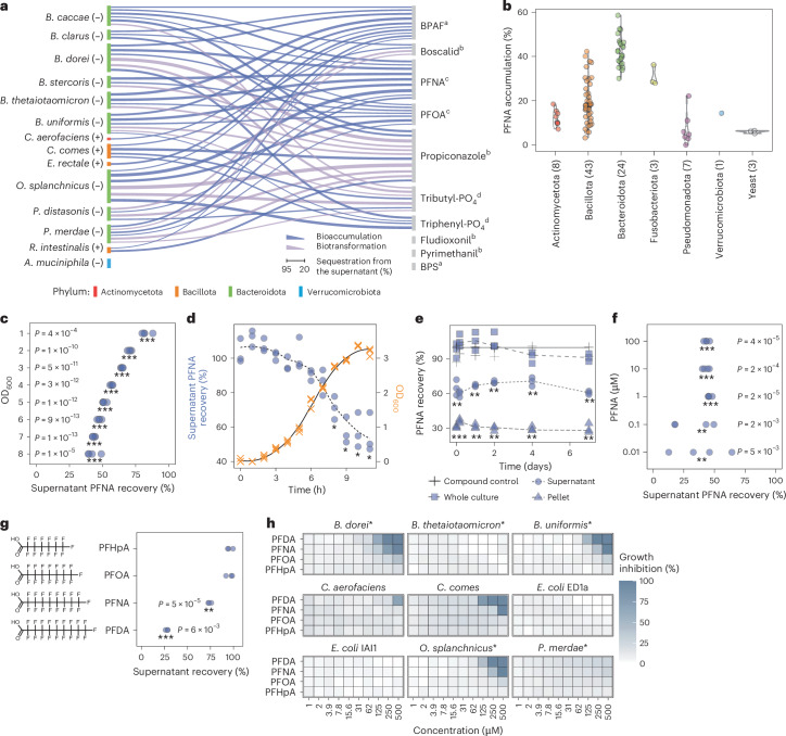 We next asked whether the fraction of PFAS sequestered was dependent on the exposure concentration. For this, we tested sequestration of PFNA by B. uniformis over a broad range of concentrations (0.01–500 µM (4.64 µg l-1 to 232 mg l-1 )). The degree of sequestration remained constant around 50%, both in growing cultures and resting cells (Fig. 1f and Extended Data Fig. 2h,i). Furthermore, the degree of bioaccumulation by B. uniformis increased with increasing PFAS chain length, from none for perfluoroheptanoic acid (PFHpA, 7C) to 60% in the case of perfluorodecanoic acid (PFDA, 10C) (Fig. 1g and Extended Data Fig. 2g). Despite this high degree of bioaccumulation, B. uniformis as well as other abundant gut bacterial strains grew well even at high micromolar concentrations (Fig. 1h). Thus, PFAS bioaccumulation occurs within 3 min without inhibiting bacterial growth up to concentrations orders of magnitude higher than known contamination levels of circa 1 nM (refs. 5, 6, 15, 40).