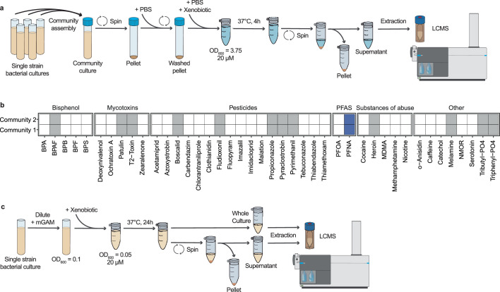 To assess the potential impact of food-borne pollutants on commensal gut bacteria, we started with a community-based screening approach. We assessed the ability of two mixtures (synthetic communities) of gut bacterial strains to sequester pollutant compounds during 4 h of exposure (Extended Data Figure 1a).