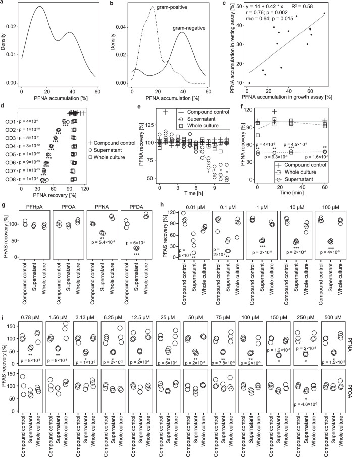 On the day of the screen, each tube was inoculated 1:1 with a second-passage culture to reach a starting OD600 of 0.05 and a concentration of 20 µM (9.3 mg l11) PFNA (Fig. 1d and Extended Data Fig. 2e). Samples were incubated at 37 °C for 11 h. Bacteria-free mGAM was added to compound control samples. OD600 was measured every hour, and supernatant, whole culture and compound control samples for PFNA analysis were collected also every hour and stored at –80 °C until extraction.