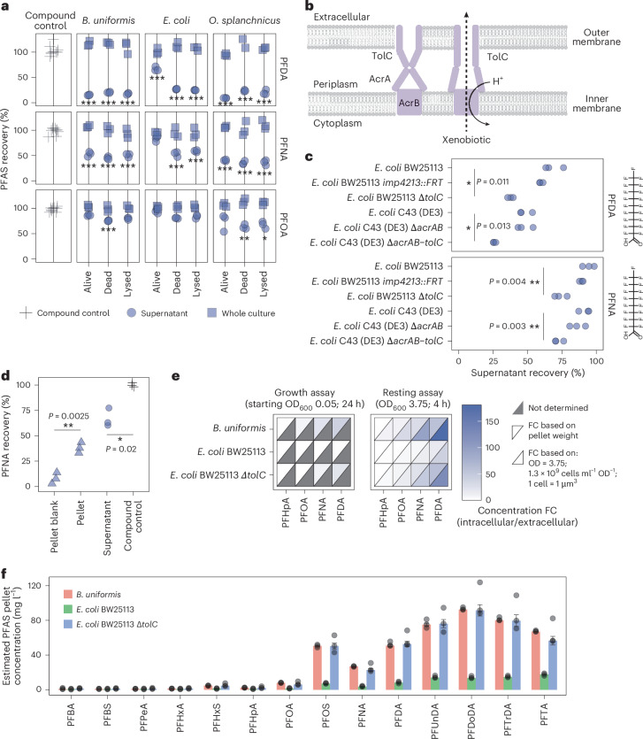 We next tested whether bacterial cells could bioaccumulate PFAS at very low exposure levels. B. uniformis cells were exposed to 0.34 nM (160 ng l-1) PFNA, a PFAS concentration observed in water samples across Europe and the United States [15, 40] and below average blood levels. [6] We validated the applicability of our liquid chromatography tandem mass spectrometry (LC–MS/MS) method for low-concentration samples using the US Environmental Protection Agency (US EPA) method [44, 45] and using another, independently developed, LC–MS/MS method (Methods). At this low exposure level, B. uniformis bioaccumulated 37% of PFNA into the bacterial pellet, concordant with depletion from the supernatant (Fig. 2d and Extended Data Fig. 3c). The estimated concentration within the bacterial pellet (wet biomass) was circa 17.7 nM (8,200 ng l-1), a 50–fold increase (Extended Data Fig. 3d). In another experiment with 5 µM (PFHpA, 1.82 mg l-1; PFOA, 2.07 mg l-1; PFNA, 2.32 mg l-1; PFDA, 2.57 mg l-1) exposure, the concentration within the wet pellet of B. uniformis and E. coli BW25113 ΔtolC ranged from circa 13 µM (5 mg l-1) for PFHpA, 50 µM (21 mg l-1) for PFOA, 130 µM (60 mg l-1) for PFNA, to 250 µM (129 mg l-1) for PFDA, that is, 3–, 8–, 25– and 60–fold increase, respectively (Fig. 2e and Extended Data Fig. 3e). As these estimates are based on wet pellet weight, intracellular concentrations will be higher. Considering the estimated number of cells per optical density (OD) unit (0.6–2 × 109 cells ml-1 OD600-1 (ref. 38)) and 1 µm3 cell volume [38], the enrichment of PFAS in bacterial cells would be 1.2–7 times higher than in the wet pellet. These results show the large capacity of bacterial cells to bioaccumulate and concentrate PFAS from their surrounding environment.
