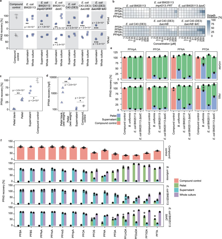 Extended Data Fig. 3f). While the E. coli wild type showed minimal bioaccumulation, E. coli ΔtolC and B. uniformis bioaccumulated almost 100% of PFAS with chain length above 10C. The percentage of bioaccumulated PFAS for individual compounds is comparable to a single compound exposure. Thus, at 1 mg l-1 per compound, PFAS bioaccumulation is additive across different molecules with minimal mixture effects.