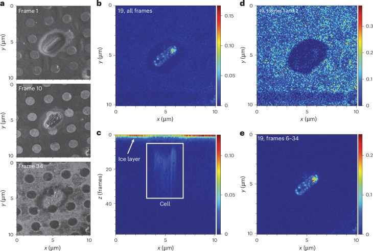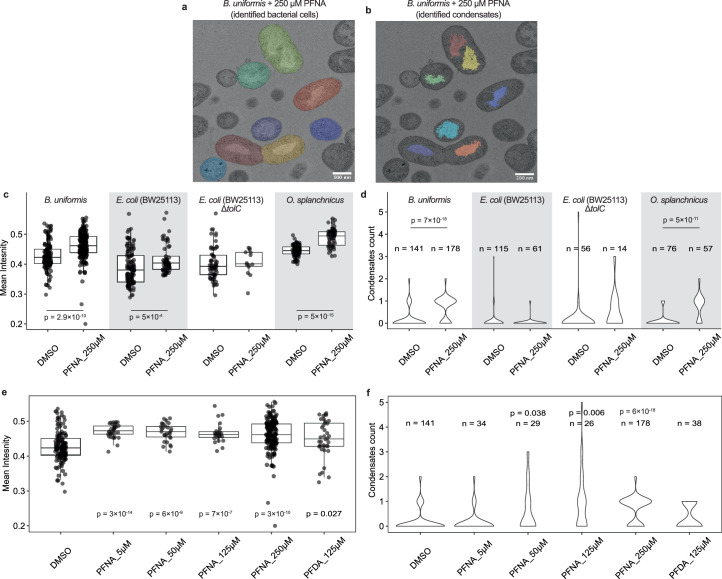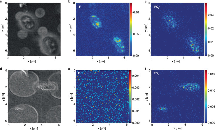 -1), well above that of most native metabolites. [46] At these concentrations, the observed degree of bioaccumulation, if considered to be membrane associated only, would imply one molecule of PFNA per two lipid molecules in the cell membrane, which is physiologically improbable. How do cells cope with such high intracellular levels of highly effective surfactants such as PFAS and maintain their growth? To begin to answer this, we used transmission electron microscopy (TEM) to visualize B. uniformis, O. splanchnicus, E. coli wild type and E. coli ΔtolC mutant exposed to PFNA. Consistent with their observed levels of bioaccumulation, all cells except E. coli wild type showed disruption and condensation of cytoplasmic content (Extended Data Fig. 4). Similar morphological features have previously been observed in Clostridium perfringens exposed to lauric acid, which also has surfactant properties. [47] We quantified cytoplasmic condensation using automated image processing (Methods). B. uniformis and O. splanchnicus showed significantly increased mean pixel intensity and number of condensates upon PFNA and PFDA exposure (Extended Data Fig. 5). However, TEM imaging can show artefacts due to extensive sample processing, including resin embedding. Therefore, to confirm PFNA localization inside the bacterial cells, we performed cryogenic focused ion beam time-of-flight secondary ion mass spectrometry (FIB-SIMS) imaging of E. coli ΔtolC cells exposed to 250 µM PFNA. This method circumvents the need to embed the specimen in resin, preserving the cells in a near-native state in vitreous ice. Voxel-by-voxel three-dimensional analysis of the bacterial cell composition uncovered a strong fluorine signal localized inside the bacterial cells, corresponding to intracellular PFNA bioaccumulation (Fig. 3 and Extended Data Fig. 6). In total, 2 biological replicates were analysed, comprising 120 E. coli ΔtolC cells exposed to 250 µM PFNA and 44 control cells. All 120 cells exposed to PFNA showed a clear fluorine signal within the bacterial cell, while 43 control cells showed no fluorine signal, and one control cell showed a very low fluorine signal. Furthermore, intracellular PFNA was unevenly distributed with a distinct tendency for aggregation. The intracellular aggregation suggests either interaction of PFAS with cytosolic contents, such as proteins and other macromolecules, or phase separation of PFNA and cytosolic contents within the bacterial cell.