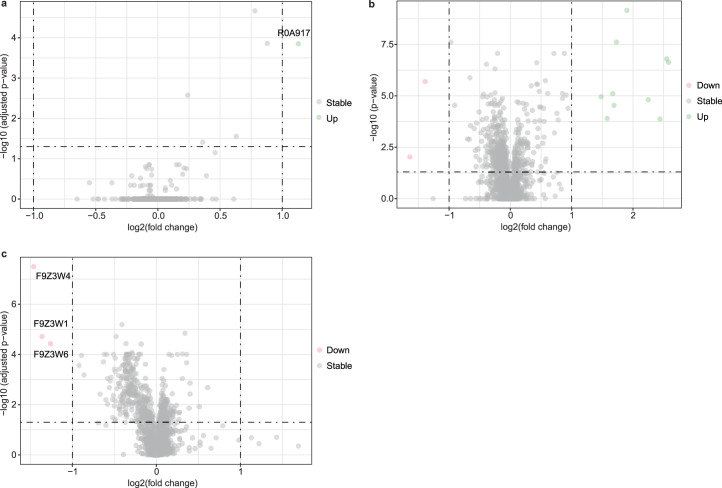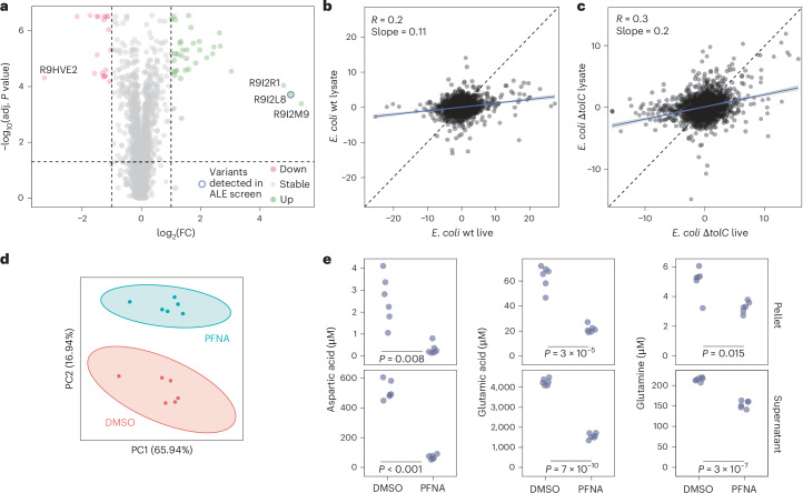 To characterize how intracellular localization of PFNA affects the molecular physiology of the bioaccumulating cells, we measured their proteomic and metabolic response. The proteome profile of the bioaccumulating E. coli ΔtolC mutant exposed to PFNA showed more changes than the non-accumulating wild type. Most PFNA-impacted proteins are either membrane- or stress response-related (Extended Data Fig. 8). B. uniformis cells exposed to PFNA also showed changes in membrane-related proteins, with the top three being efflux pumps, viz. R9I2M9 efflux transporter resistance–nodulation–cell division (RND) family, R9I2R1 NodT family efflux transporter and R9I2L8 hydrophobe/amphiphile efflux-1 (HAE1) family RND transporter (Fig. 4a). Missense variants of the latter RND transporter (R9I2L8) were also identified in all four PFNA-evolved B. uniformis populations with high (>0.92) allele frequencies. The proteomic and genomic changes together show the involvement of efflux pumps in B. uniformis in cellular interaction with PFAS, as we also found for E. coli. To identify proteins interacting with PFNA, we used thermal proteome profiling (TPP), which allows proteome-wide assessment of structural changes (stabilization or destablization) upon ligand binding. [48, 49] We thus compared E. coli wild type and ΔtolC mutant exposed to PFNA, with the exposure before or after cell lysis, with the latter removing the membrane barrier for PFNA–protein interactions. The bioaccumulating ΔtolC mutant featured 10–fold more PFNA-interacting proteins (Supplementary Table 5). Furthermore, the thermal proteomic responses in the lysate and the live cells are more similar for the mutant than for the wild type, consistent with increased intracellular PFNA bioaccumulation in the ΔtolC mutant (Fig. 4b,c).