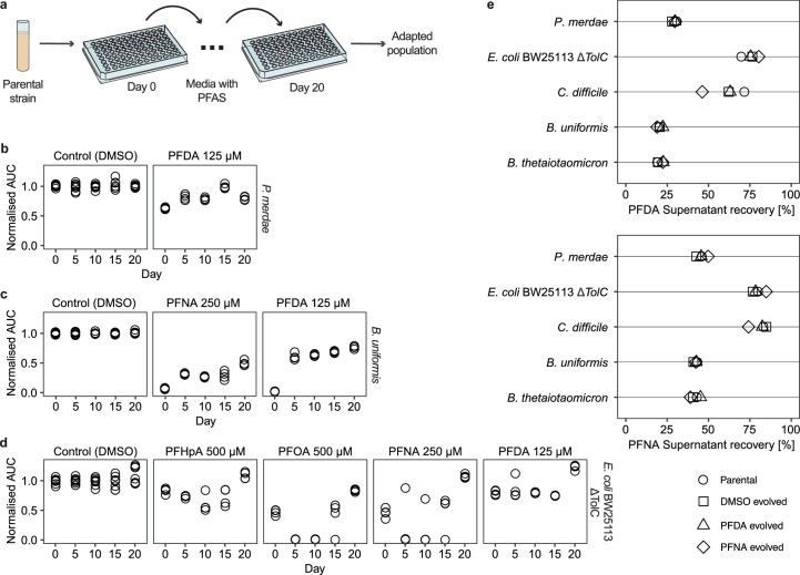 We next reasoned that if the cells had mechanisms to modulate bioaccumulation and/or to cope with high intracellular levels, resistance to inhibitory PFAS exposure would rapidly evolve under natural selection. We therefore evolved, through serial transfer, B. uniformis, B. thetaiotamicron, P. merdae, C. difficile and E. coli ΔtolC in a medium with 500 µM (182 mg l-1) PFHpA, 500 µM (207 mg l-1) PFOA, 250 µM (116 mg l-1) PFNA or 125 µM (64 mg l-1) PFDA (Extended Data Fig. 7a). Within 20 transfers (20 days) — corresponding to circa 100 generations — P. merdae (PFDA), B. uniformis (PFNA, PFDA) and E. coli ΔtolC (all tested PFAS) showed between 1.3– and 46–fold increase in growth (Extended Data Fig. 7b–d). Notably, the evolved cells retained the bioaccumulation capability of the respective parental strains (Extended Data Fig. 7e). Genome sequencing of evolved B. uniformis populations identified 55 variants linked to PFNA and PFOA exposure (Supplementary Table 4). More than half of the variants are in non-coding regions, suggesting that changes in gene expression contribute to the adaptation of B. uniformis to PFAS.