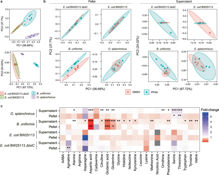 The proteomic changes in efflux pump and other membrane-related proteins could be expected to result in altered levels of cellular metabolites. To test this, we used a targeted metabolomics method aimed at broadly conserved metabolites, including amino acids and vitamins. Metabolic changes were observed only for the bioaccumulating strains. B. uniformis, one of the highest bioaccumulators, showed a distinct metabolic response to PFNA exposure (Fig. 4d,e and Extended Data Fig. 9). Metabolites with altered levels include amino acids aspartate, glutamate and glutamine, and kynurenine, a metabolite implicated in the gut–brain axis. [50, 51] Increased cadaverine levels, along with decreased glutamate and glutamine levels, indicate B. uniformis response like that observed in acid stress. [52–54]