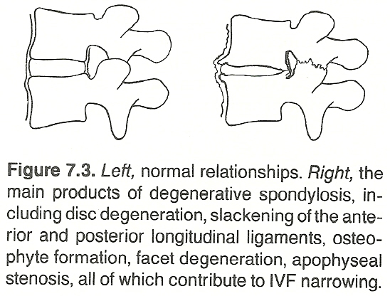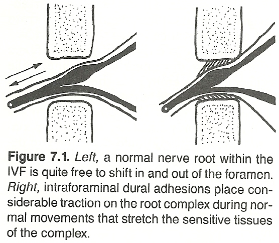 It should be kept in mind, however, that the IVF is usually quite roomy. There can be complete disc collapse without any degree of compression. Also, there can be considerable compression on a root without any overt signs of malfunction if the pressure develops slowly and adaptation is sufficient. Entrapment, from whatever cause, can be encouraged by a transforaminal ligament, an adhesion, or an overgrowth restricting the normal mobility of the root in the IVF.
