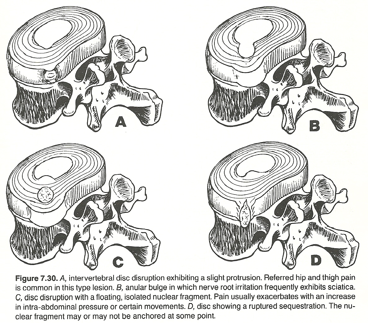 Many authorities attribute most lumbosciatic pains to IVD faults. The typical disc lesion is thought to produce restrictions in the dura mater during straight-leg-raising or neck flexion tests.