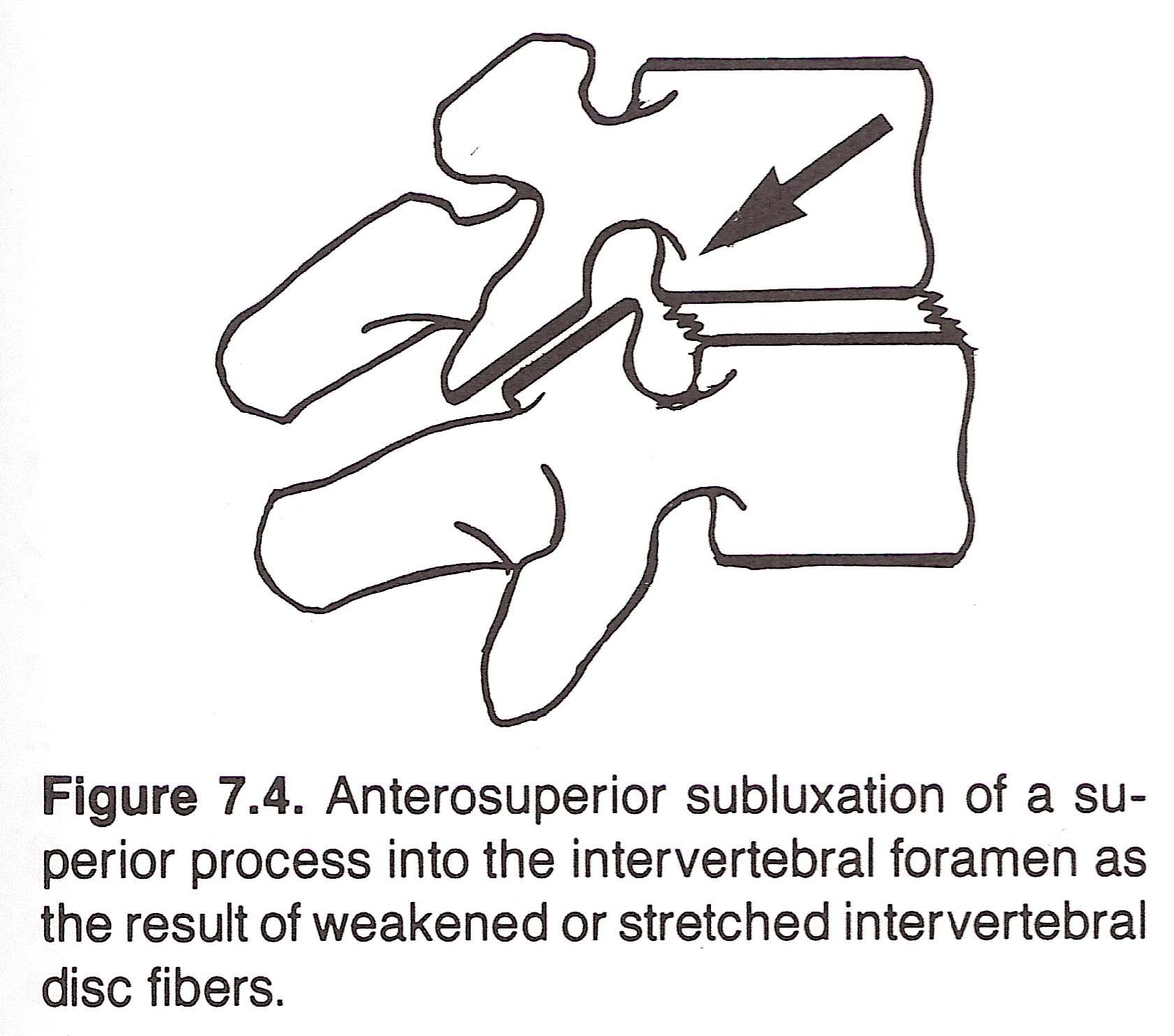 During their exit from the IVFs, the nerve roots course close to the inner edge of the superior facet. In subluxation, the superior process can override the surface of the inferior process and produce direct irritation of the root by the inferior process, with or without compression. (See Figure 7.4) Direct compression also can result by the root being caught between the inferior process and the body of the superior vertebra or caught between a hypertrophied inferior process and the superior body. Olsson and coworkers, however, reported that mechanical pressure on a root is more often from the formation of edema within the nerve sheaths and epineurium, regardless of cause.
