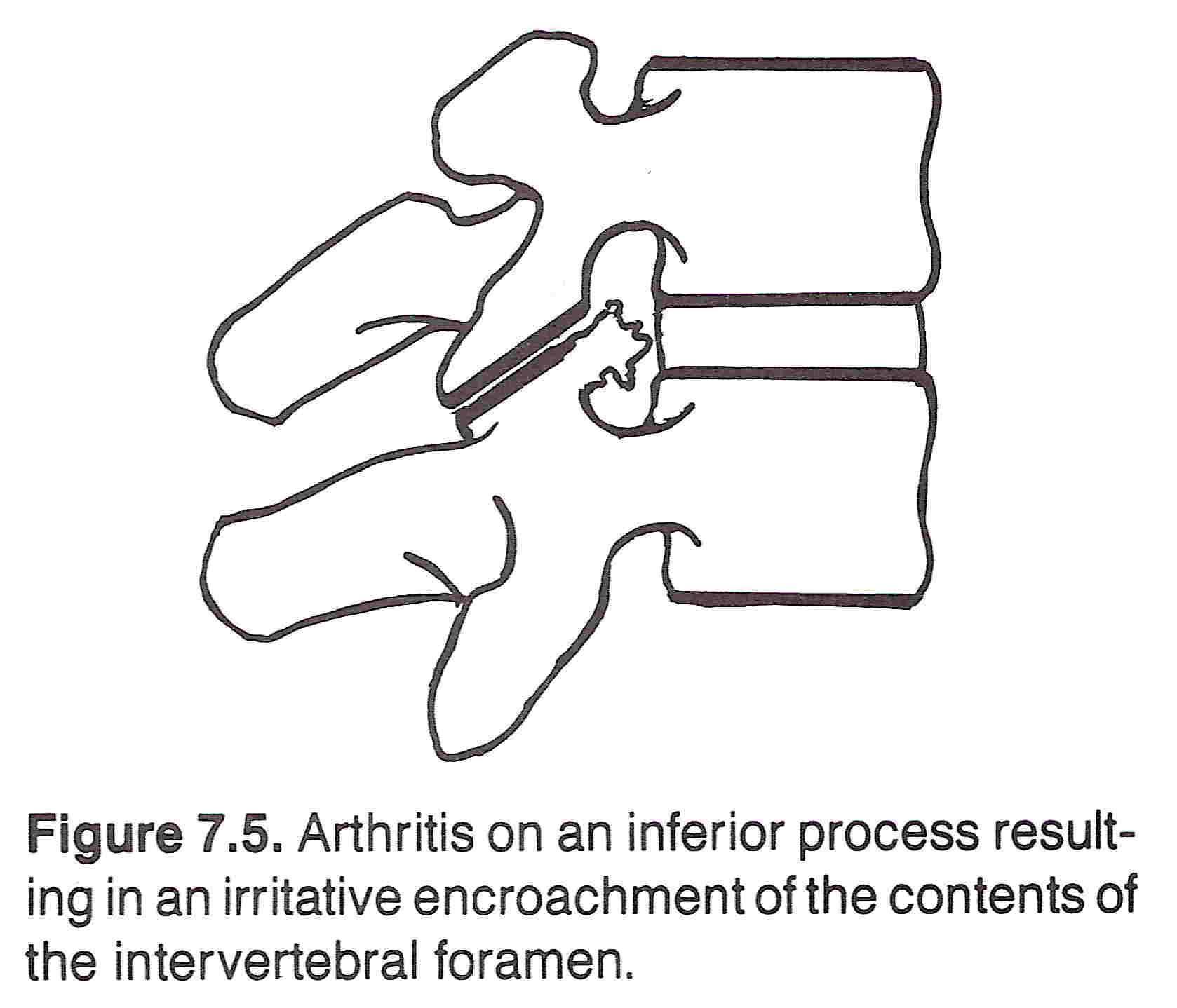 This type of compression usually occurs from arthritic hypertrophy of an articular facet. (See Figure 7.5) It is an occurrence often associated with advanced spondylosis. The bony mass often compresses the nerve root lying beneath the medial border of the superior articular facet. The root is caught between the posterior aspect of the vertebral body and the facet. Besides somatic sensory and motor manifestations, hearing, visual, and equilibrium disturbances may be associated, according to Pang, Chrisman/Gervais, Davis, and others.