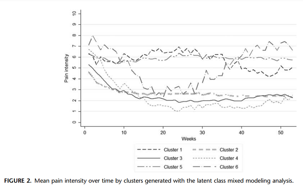 In contrast, 1 of the weaknesses we observed is that some of the trajectories had very few individuals (cluster 6: n=9; cluster 1: n=21), making cluster-specific regression analyses inappropriate due to lack of power. Instead, we opted for grouping clusters in favorable and unfavorable classes to identify associations with relevant baseline characteristics. In addition, although we performed analyses in multivariable models for the associations between baseline characteristics and an unfavorable trajectory, we might have a problem with residual and unmeasured confounding in these results. Last, it is likely that a different exposure categorization had led to slightly different results: for instance, by using either a continuous variable for duration of pain or more detailed categories.