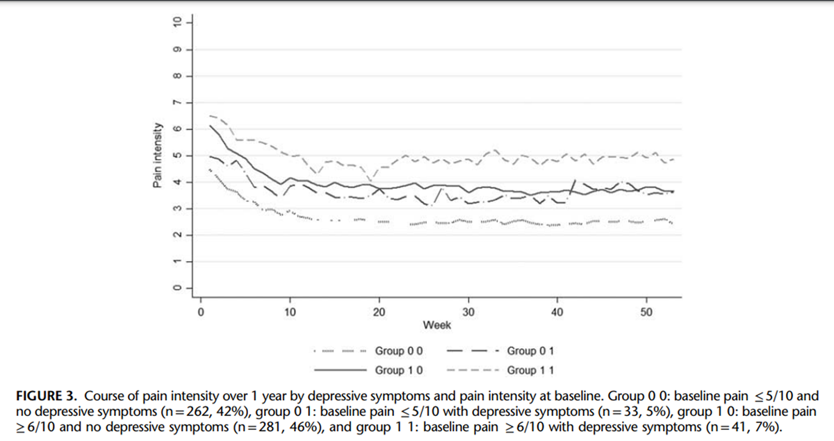 Results: Six different clusters of trajectories were identified. Most participants (73%) followed a trajectory of decreasing pain throughout follow-up. The remaining experienced unfavorable trajectories: persistent pain of high intensity (22%) and slightly (3%) or highly (2%) fluctuating levels of pain reaching high levels of pain intensity. Pain intensity at baseline: odds ratio (OR): 3.76 (95% confidence interval [CI]: 2.49–5.68), depressive symptoms: OR: 3.46 (95% CI: 2.01–5.95), younger age: OR: 2.29 (95% CI: 1.48–3.54), female sex: OR: 1.51 (95% CI: 1.01–2.26), and sudden onset of pain: OR: 1.74 (95% CI: 1.13–2.69) were associated with unfavorable trajectories.