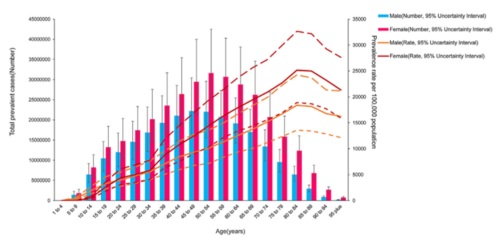 Results showed that the worldwide prevalence, incidence and YLD rates were higher in women than in men and increased with age, and then peaked at the age group of 8084 years old for both sexes in 2019. Moreover, the number of prevalent, incident and YLD cases was also increased with age and peaked at the age group of 4554 years old for both sexes, and then the decreasing trends were observed up to the oldest age group (Figure 3, Supplementary Figs. S8 and S9). It is noteworthy that there were no statistically significant differences between females and males in terms of prevalence, incidence, and YLD across all age groups.