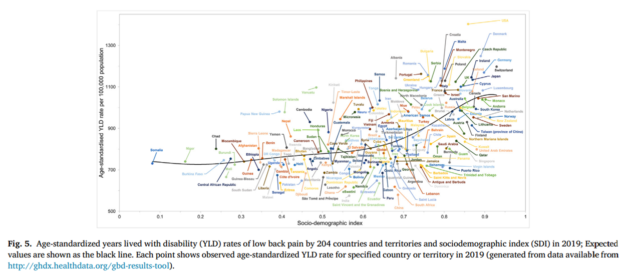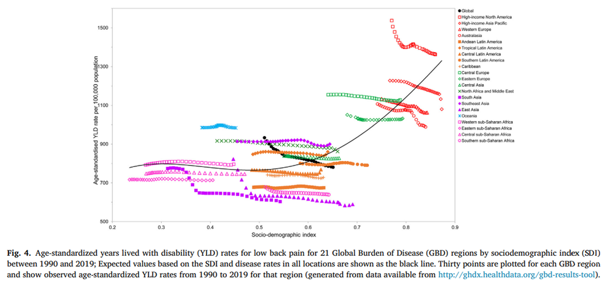 Our analyses of the present study reveal that the developing level of countries is one of the important contributing factors for LBP burden, which has not been reported in previous studies. Interestingly, although there was an overall positive association between age-standardized YLD rate of LBP and SDI, the age-standardized YLD rate of LBP at the regional level displayed a decreasing trend with the increasing SDI during 19902019. Moreover, the high burden of LBP was not limited to countries with a high SDI level, but was also observed in countries with a middle and low SDI level. Possible explanations for this confusing phenomenon are likely to be complicated and may be owing to the differences among different countries and the different times of the identical country in the levels of aging, physical inactivity, occupation and obesity. For example, Vanuatu, which has a low SDI level and a high YLD rate of LBP, is accompanied by substantially increased prevalence of obesity and sedentary recreation in economic development. [24, 25] This discrepancy could, in part, contribute to the high burden of multiple disorders or diseases, including LBP, in this country. On the basis of the above association between age-standardized YLD rate of LBP and SDI, healthcare policy makers can establish precise preventive strategies for LBP by comparing the burden observed with the expected burden based on the SDI.