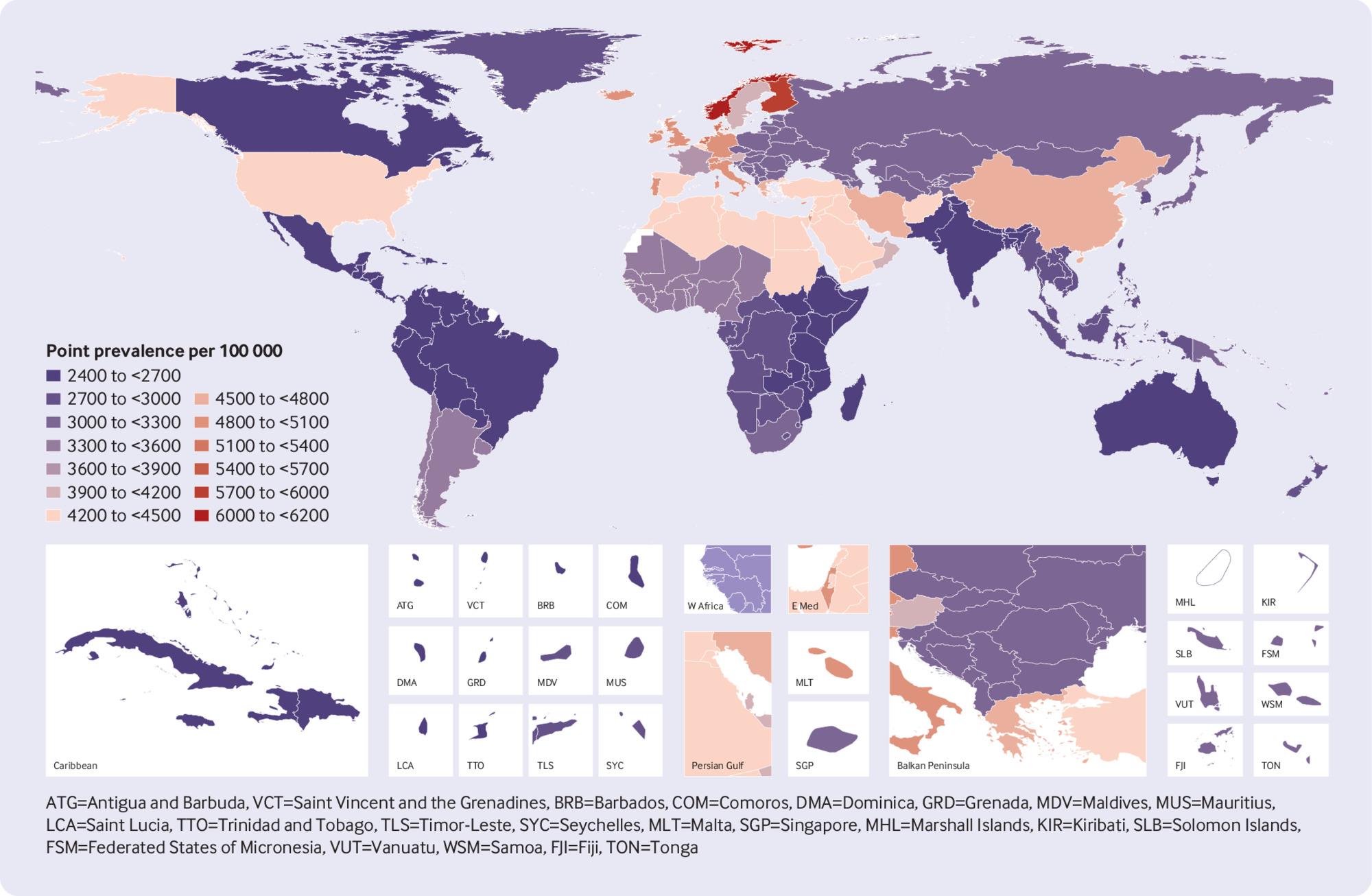 The percentage change in age standardised point prevalence estimates per 100 000 population from 1990 to 2017 differed substantially between countries, with the largest increases in the UK (14.6% (10.6% to 18.8%)), Sweden (10.4% (6.0% to 15.4%)), and Kuwait (2.6% (2.0% to 3.2%)). In contrast, Taiwan (–10.5% (–18.4% to –1.5%)), New Zealand (–7.4% (–11.2% to –3.5%)), and Qatar (–2.6% (–3.0% to –2.1%)) showed the largest decreases from 1990 to 2017 (Supplementary table S2).