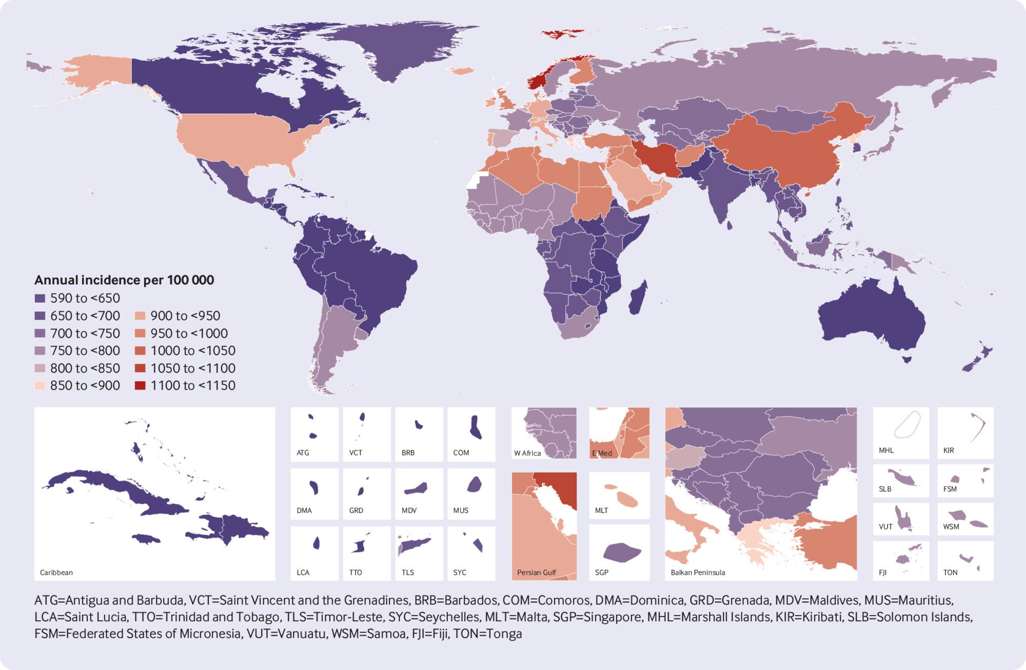 The highest age standardised annual incidences of neck pain per 100 000 population were in east Asia (1029.0 (95% uncertainty interval 910.5 to 1166.1)), North Africa and the Middle East (975.6 (864.6 to 1109.0)), and high income North America (906.4 (812.5 to 1012.5)). These rates were lowest for Andean Latin America (624.0 (550.3 to 708.3)), the Caribbean (624.4 (550.6 to 708.6)), and Australasia (624.5 (552.4 to 710.8)) (table 1).