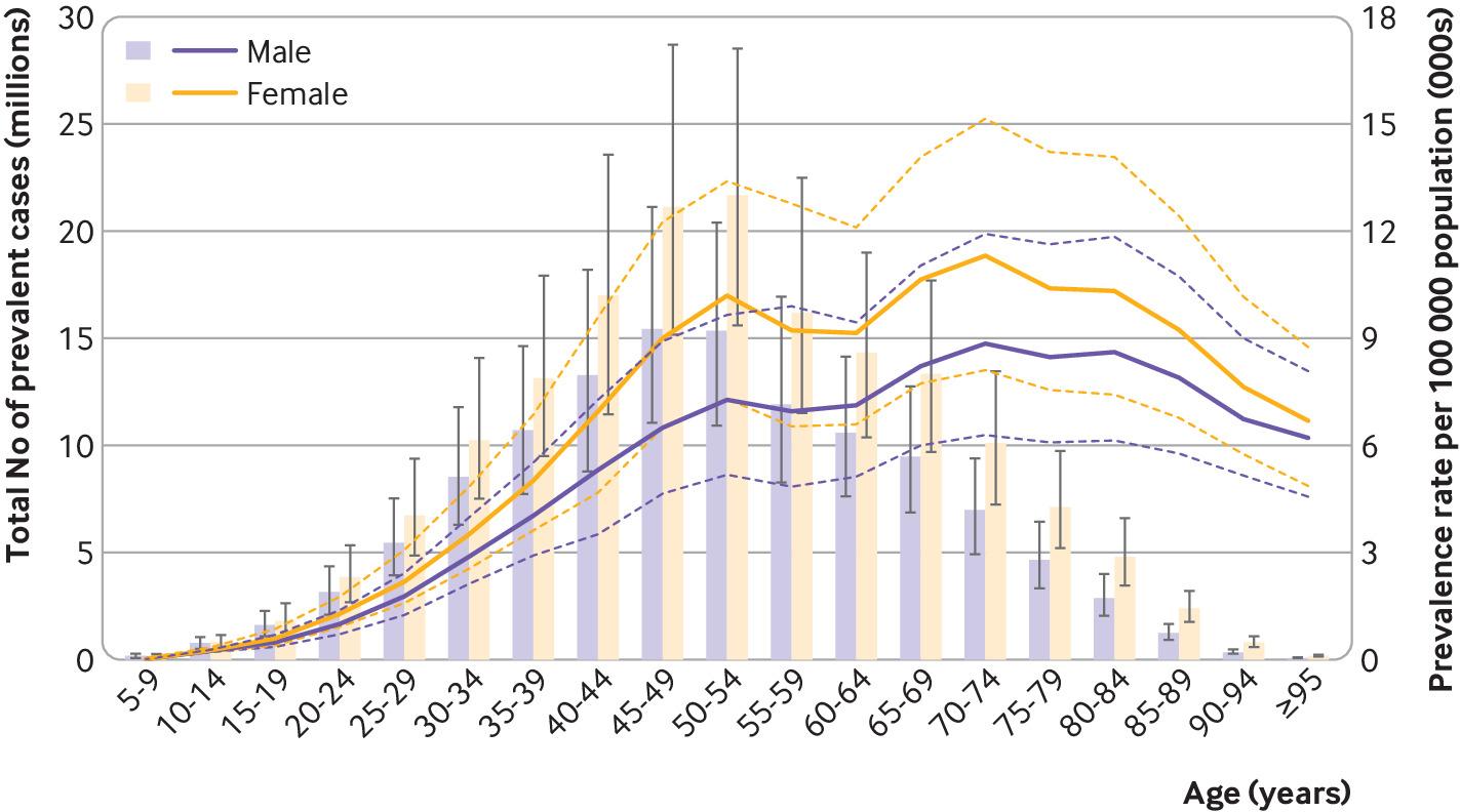 The point prevalence estimate of neck pain was found to be higher in females across all age groups, confirming the findings of previous studies.4819 In addition, point prevalence estimates in our study peaked at middle ages, which is also confirmed by other studies. [4, 8, 19] The highest burden was among men aged 45-49 years and women aged 45-54 years. This has direct implications for clinical practice and policy, as preventive and educational approaches targeting these specific groups should be encouraged globally. Whereas neck pain has been a relatively understudied condition, a strong evidence base exists for low back pain. It is likely that the guidance for low back pain — to keep imaging to a minimum and to provide advice and education to remain active — can be extrapolated to neck pain, but this remains to be determined.