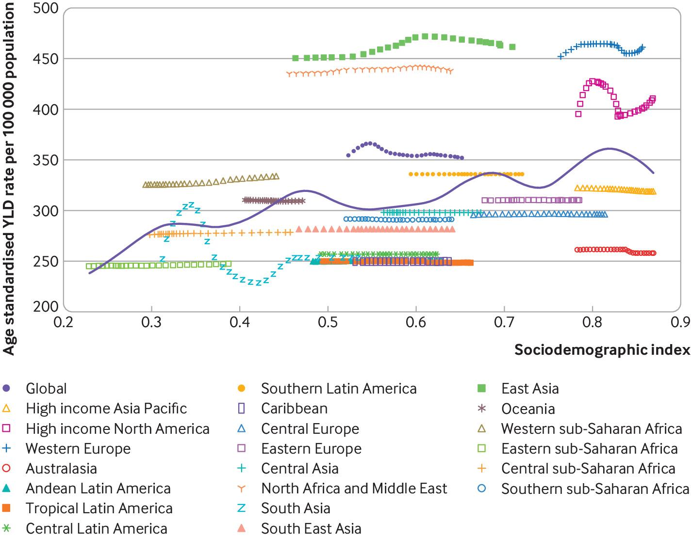 Overall, a positive association was observed between the age standardised years lived with disability from neck pain and sociodemographic index at a global level as well as across Global Burden of Disease regions. Namely, the burden of neck pain is increased at higher levels of socioeconomic development (Figure 4).