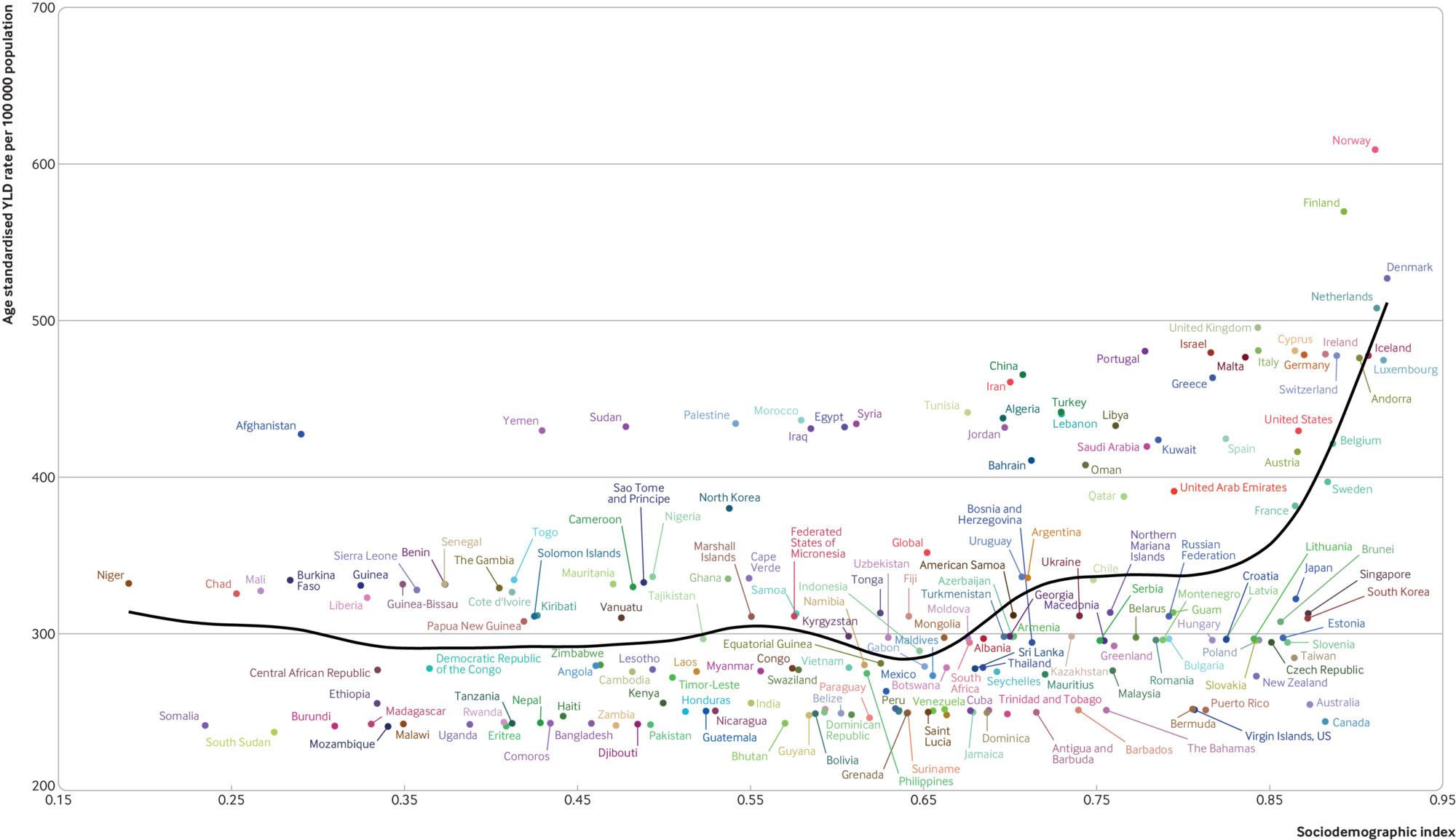 RESULTS: Globally in 2017 the age standardised rates for point prevalence of neck pain per 100 000 population was 3551.1 (95% uncertainty interval 3139.5 to 3977.9), for incidence of neck pain per 100 000 population was 806.6 (713.7 to 912.5), and for years lived with disability from neck pain per 100 000 population was 352.0 (245.6 to 493.3). These estimates did not change significantly between 1990 and 2017. The global point prevalence of neck pain in 2017 was higher in females compared with males, although this was not significant at the 0.05 level. Prevalence increased with age up to 70-74 years and then decreased. Norway (6151.2 (95% uncertainty interval 5382.3 to 6959.8)), Finland (5750.3 (5058.4 to 6518.3)), and Denmark (5316 (4674 to 6030.1)) had the three highest age standardised point prevalence estimates in 2017. The largest increases in age standardised point prevalence estimates from 1990 to 2017 were in the United Kingdom (14.6% (10.6% to 18.8%)), Sweden (10.4% (6.0% to 15.4%)), and Kuwait (2.6% (2.0% to 3.2%)). In general, positive associations, but with fluctuations, were found between age standardised years lived with disability for neck pain and sociodemographic index at the global level and for all Global Burden of Disease regions, suggesting the burden is higher at higher sociodemographic indices.