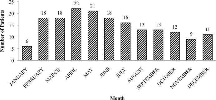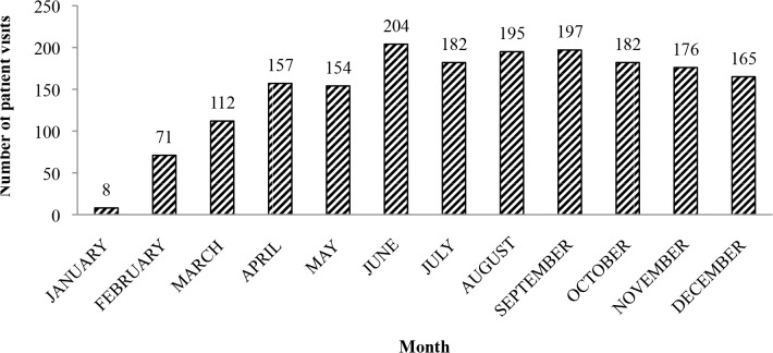 During the first four months of clinic operation both new patient visits (Figure 1), and total patient visits (Figure 2) increased steadily. During the final five months of the year it appeared that a steady state of clinic operation had been reached. There was a mean of 14.8 new patients (177/12) per month, and 135.5 ([1803-177]/12) follow-up visits per month during the inaugural clinic year.