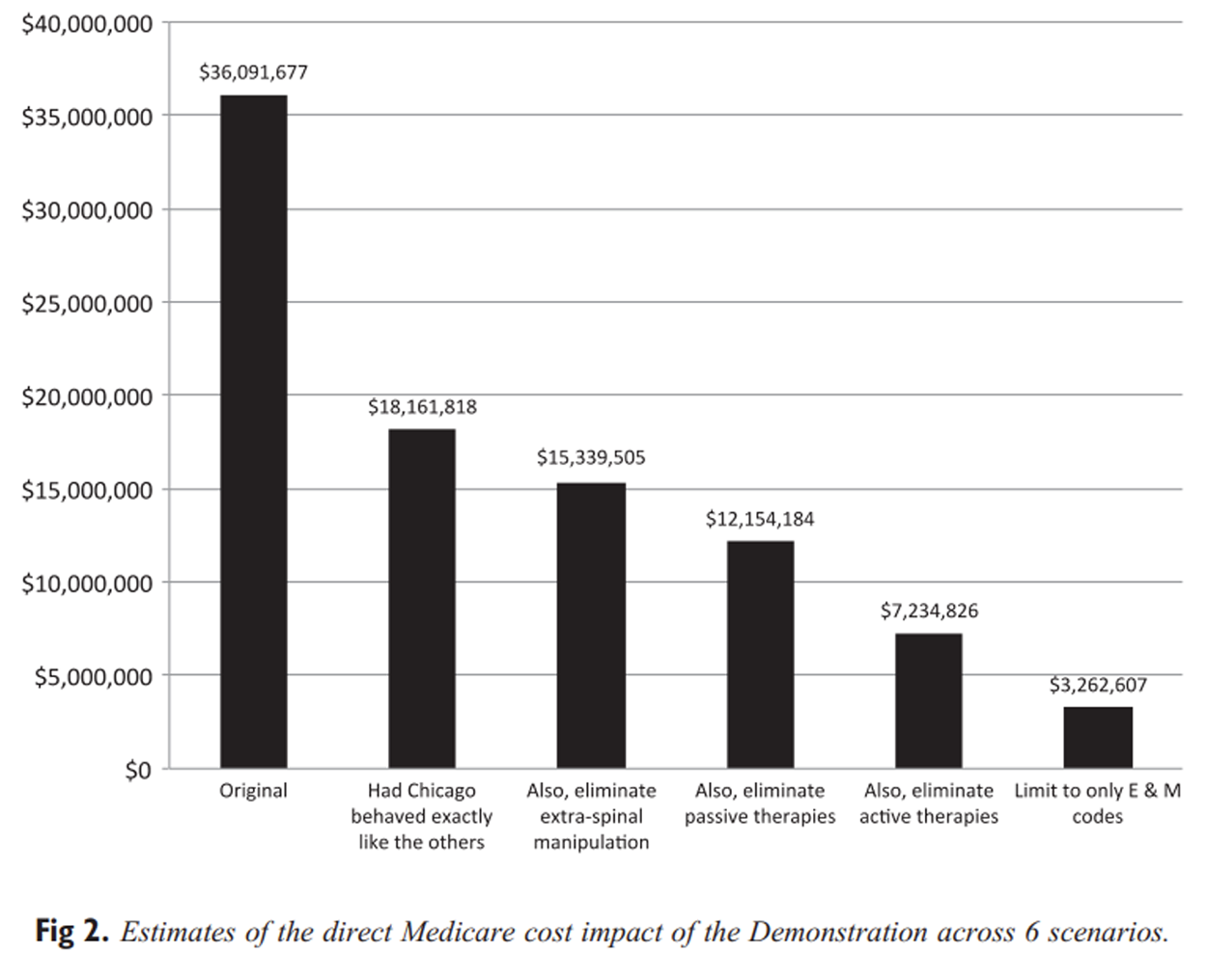 Second, the Demonstration expanded reimbursement for a very broad range of services provided by DCs. Because policymakers might reasonably limit Medicare coverage to a narrower range of services, we wanted to examine the effects of limiting coverage options on total cost increases.